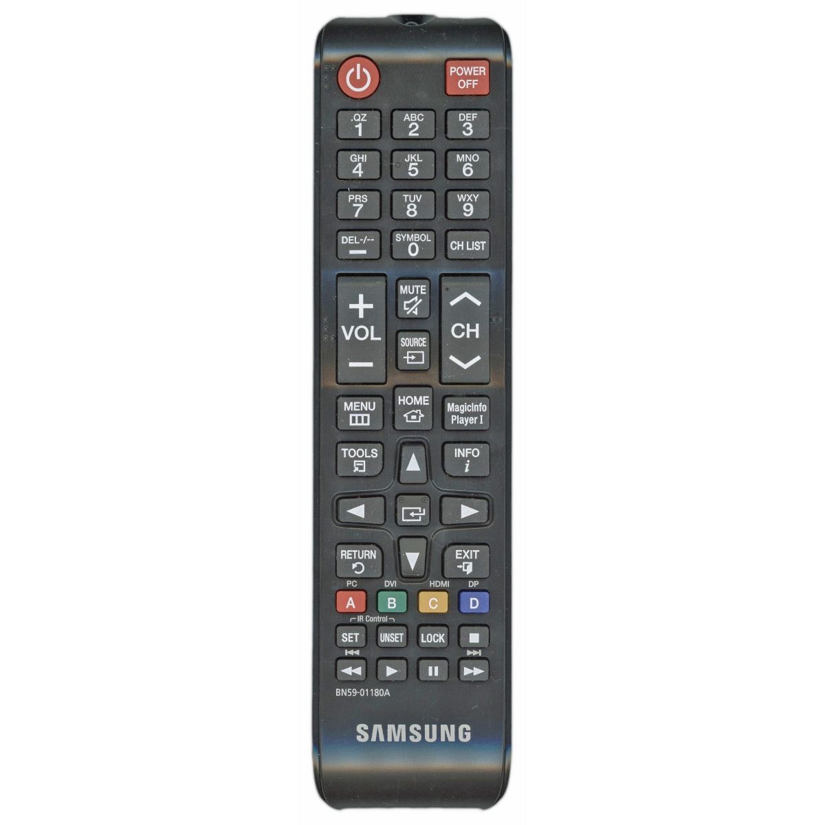 The BN59-01180A is an original infrared (IR) remote control designed for 2013 Samsung commercial display and digital signage monitors. It provides full access to display setup, input selection, and menu navigation—no programming required. This remote is compatible with professional signage and monitor models only and will not work with standard Samsung consumer TVs.