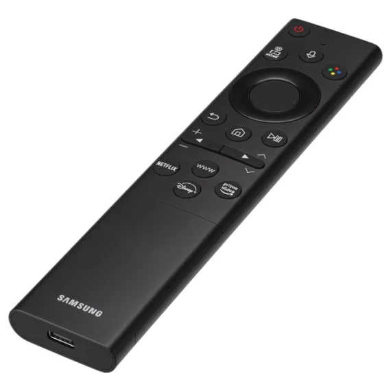 The BN59-01385L is an authentic Eco-Smart Solar-Cell remote designed for select 2022–2024 European Samsung Smart TVs. It features app shortcut buttons for Netflix, Prime Video, Disney+, and Samsung Internet (WWW) for instant access to streaming and web services. Powered by solar energy with USB-C backup charging, this remote connects via Bluetooth and includes built-in voice functionality for easy control.