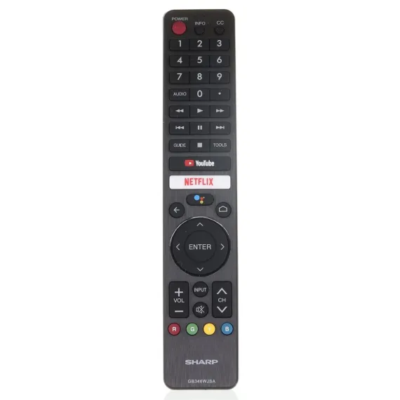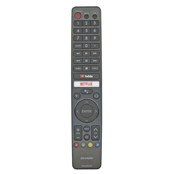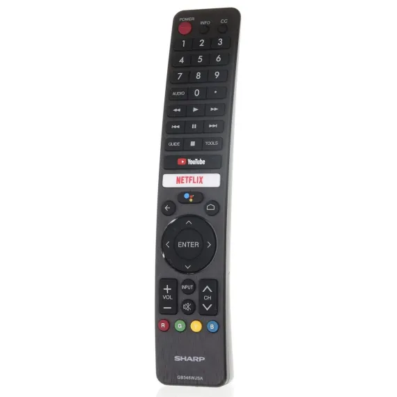 The GB346WJSA remote control provides seamless operation for compatible Sharp Google Smart TVs. Featuring built-in Google Assistant, RF connectivity, and quick-access buttons for Netflix and YouTube, it ensures fast navigation without programming required. This remote is designed specifically for Sharp Aquos TVs and will not work with non-Google TV models.