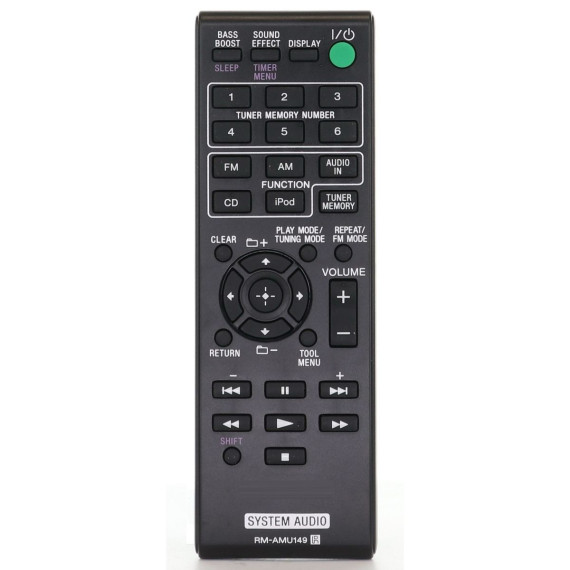 The RM-AMU149 Audio Remote Control offers precise control over compatible Sony audio devices, enhancing user convenience with easy access to essential functions. Designed for seamless integration, this remote simplifies operation, allowing professionals and enthusiasts to manage audio settings effortlessly from a distance. Its ergonomic layout and reliable performance make it an essential accessory for optimizing your audio system experience. Originally supplied with models: CMTV10IP
