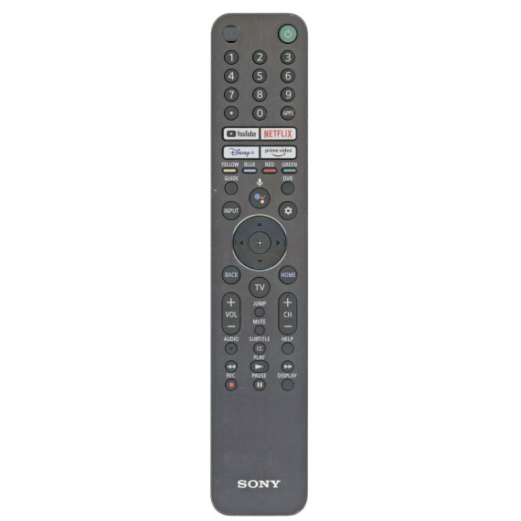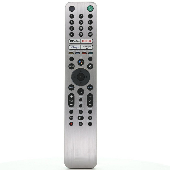 The RMF-TX621U is a premium smart TV remote control featuring a metal front, backlit buttons, and built-in voice control for enhanced usability in any lighting condition. It includes smart shortcut keys for YouTube, Netflix, Disney+, and Prime Video, and is compatible with a wide range of Sony Bravia and XR series TVs.