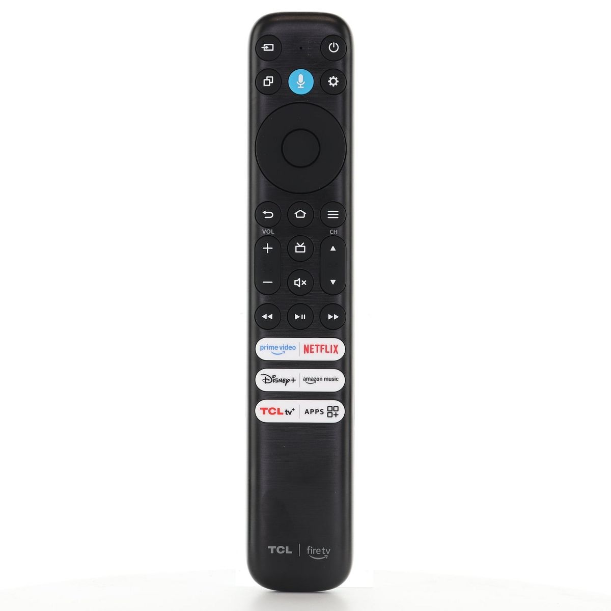 The RC813 CMC9 is an original Fire TV remote with built-in Alexa voice control for quick navigation and content search. It features dedicated app shortcut buttons including Netflix, Prime Video, Disney+, Amazon Music, and TCLtv+ (shortcuts may vary). No programming required for compatible TCL Fire TV models.