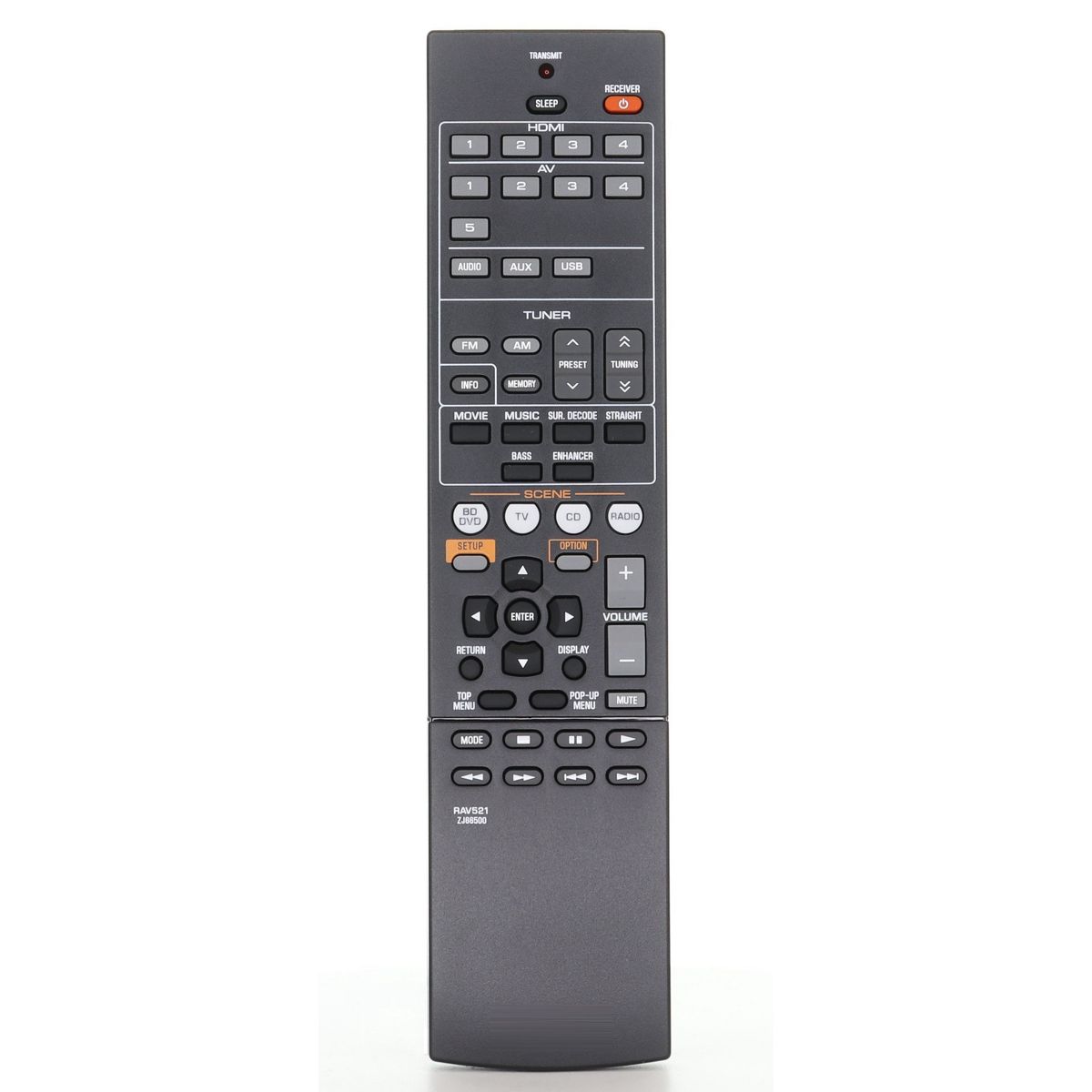 The RAV521 remote control is an original infrared remote designed for select Yamaha A/V receivers and home theater systems. It provides full control of receiver settings including power, volume, input selection, and surround modes, with no programming required for compatible models.
