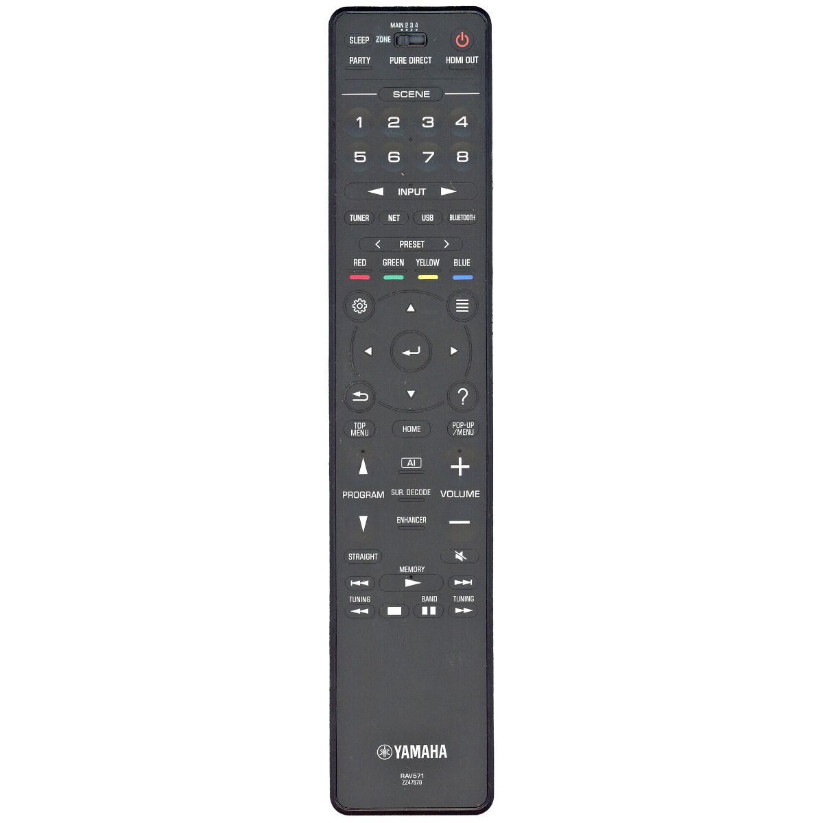 The RAV571 remote control is designed for select Yamaha A/V receiver systems, featuring intuitive layout and touch-sensitive backlighting for low-light operation. This genuine Yamaha remote provides full control over audio, input selection, and surround settings without requiring programming.