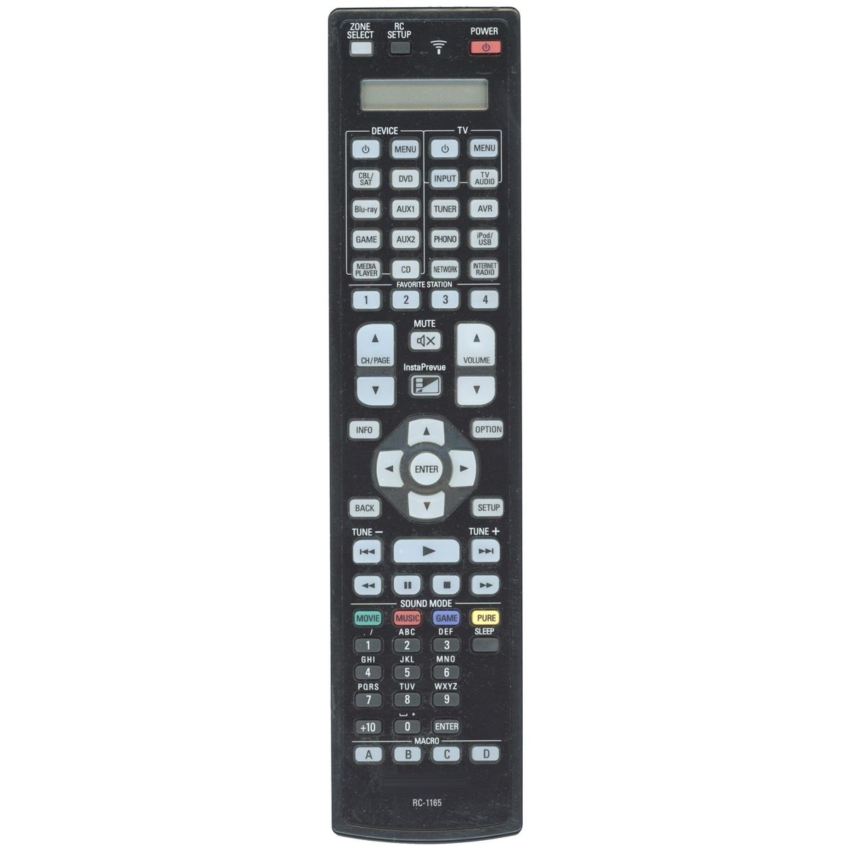 The RC-1165 remote control (30701010600AD) is the original IR remote for select high-end Denon A/V receivers. It features an LCD display and illuminated buttons for convenient operation in low-light settings. Designed to provide full control of inputs, tuner, surround sound modes, and system settings. No programming required for listed receivers.