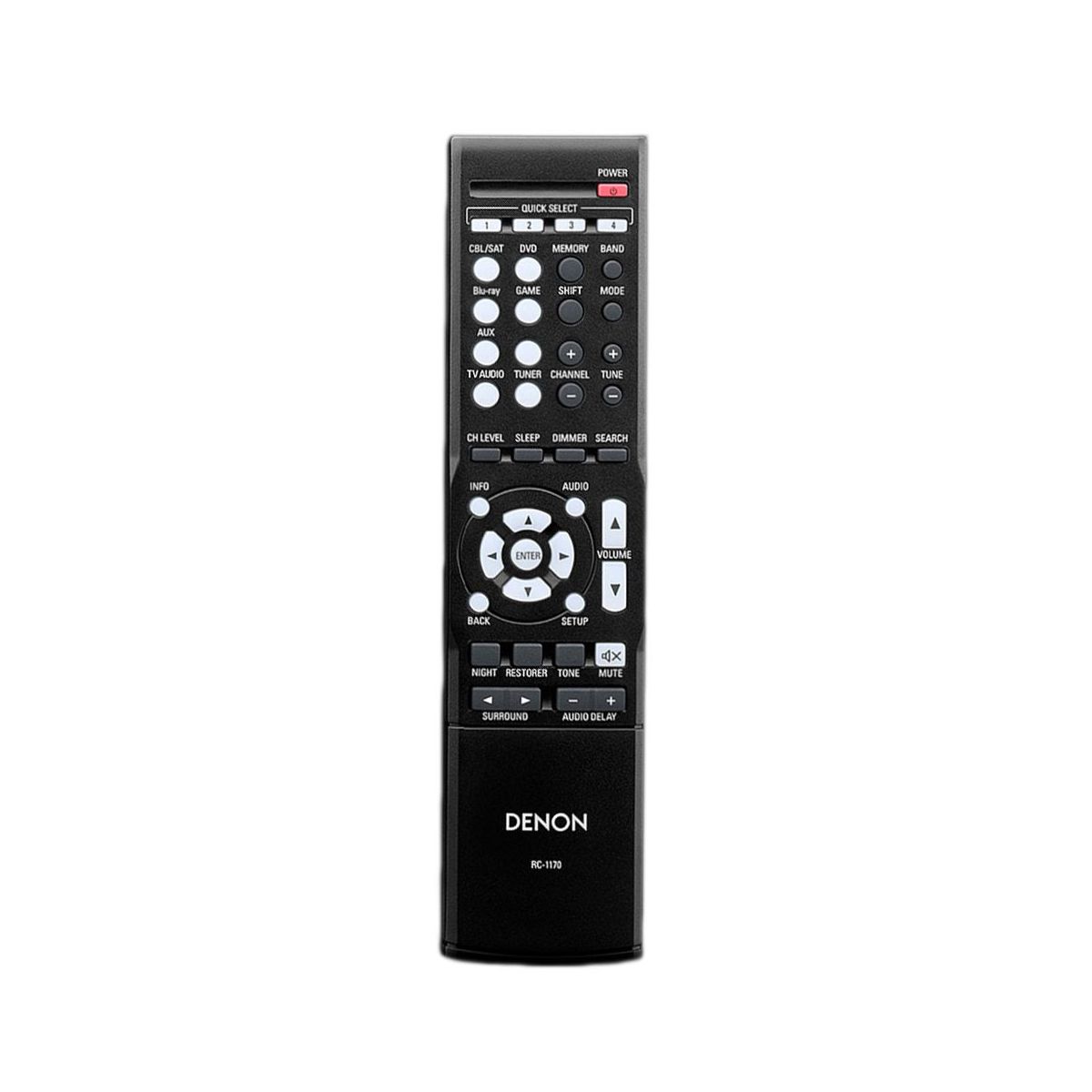 The RC-1170 is the original IR remote control designed for the Denon AVR1513 receiver (2012 model year). It provides direct control of key receiver functions such as input selection, sound modes, and volume adjustment with no programming required. This remote is IR only and does not support RF or voice features.