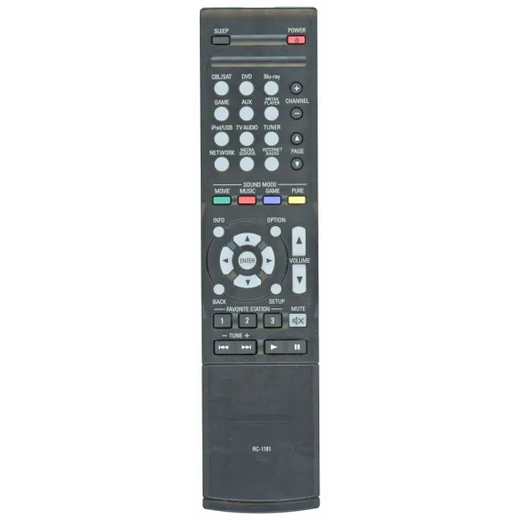 The RC-1181 is the original IR remote control designed for the Denon AVRE300 home theater receiver. It provides direct access to essential functions such as input selection, sound modes, and volume adjustments with no programming required. This remote is IR only and does not support RF or voice features.