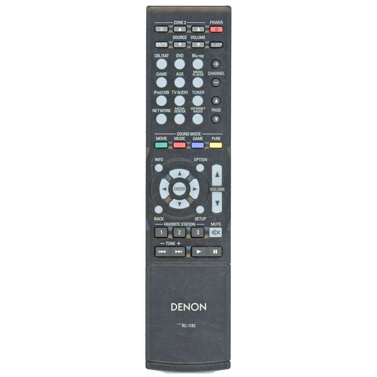 The RC-1182 is an original IR remote control made for the Denon AVRX1000 receiver. It allows easy access to essential receiver functions such as input selection, sound modes, and volume adjustments with no programming required. This remote is IR only and does not support RF or voice features.