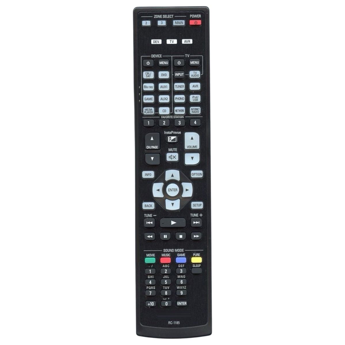 The Denon RC-1185 is an original IR remote control designed for select Denon AV receivers. It provides convenient access to receiver functions including input selection, sound modes, and volume control with no programming required. This remote is IR only and does not support RF or voice features.