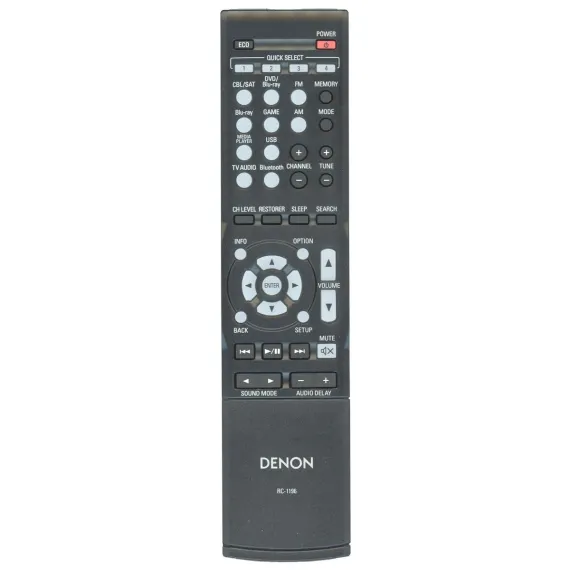 The RC-1196 is the original IR remote control for select Denon A/V receivers, providing simple access to receiver functions such as volume, input selection, and sound modes. No programming is required for compatible models. This remote is IR only and does not support RF or voice features.
