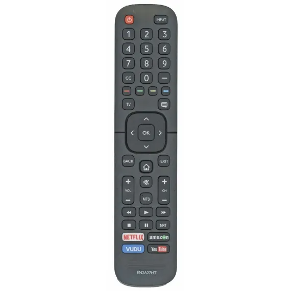 The EN2A27HT is a remote control designed for Hisense television models from 2018 to 2019. Featuring responsive infrared technology, it ensures accurate signal transmission and reliable operation. The intuitive button layout provides easy access to power, volume, channels, and inputs.