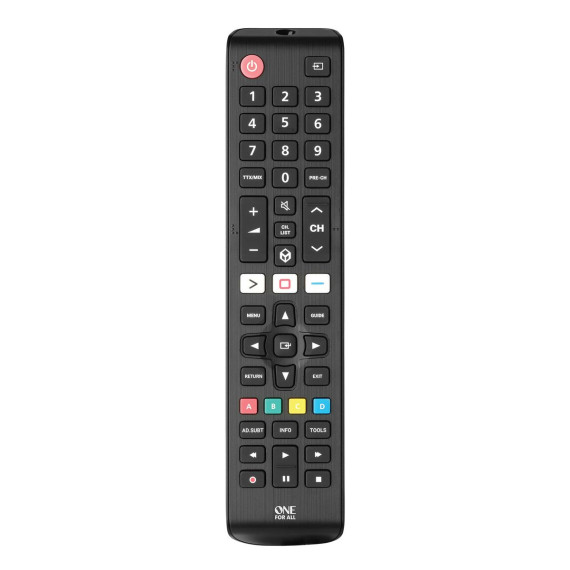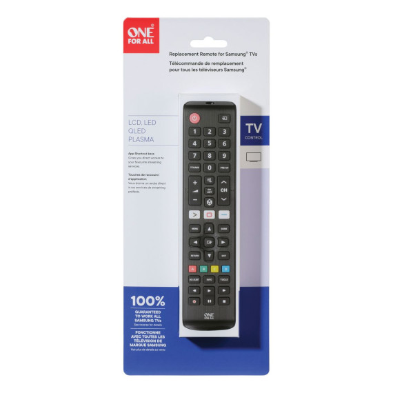 One for All's Replacement Remote for Samsung® TVs will help you work your Samsung® TV so you can get back to watching your favorite shows. Just put batteries in and it works. Control the volume (and mute) of your sound bar/audio receiver thanks to the audio feature. Set up the remote to control your TV and sound bar/audio device as if they were 1! The remote features 3 handy shortcut keys to your favorite streaming services. You will be just 1 key press away from Amazon Prime®, YouTube™, Netflix®, or any other online streaming app. Easily use the learning feature to fully customize this remote to your needs, so you will not miss any key._