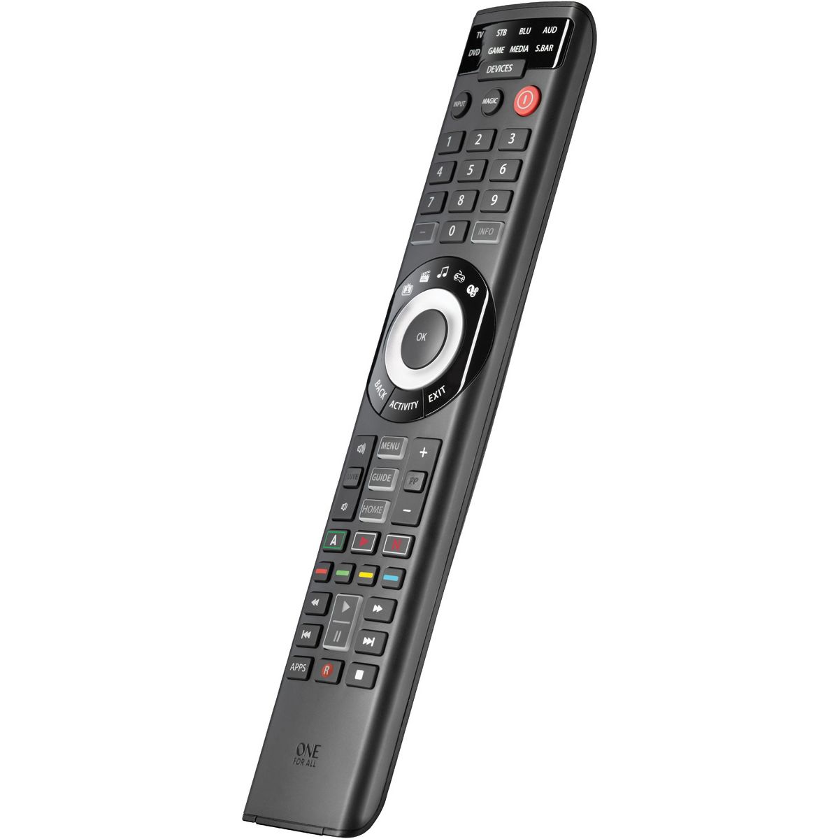 Get rid of all your other remotes by using this One For All Smart Control 8 Universal Remote! It can control up to 8 devices and can control multiple devices as if they were a single unit by using the 4 pre–programmed activities. Easy setup takes 3 short steps. The Smart Control also features 3 handy shortcut keys to your favorite streaming services so you'll be just 1 key press away from Amazon Prime, YouTube, Netflix or any other online streaming app. The Smart Control is the first preprogrammed universal remote with a free app for the easiest setup ever of your devices. This universal remote is also 100% future-proof. Devices that do not even exist yet can be controlled with the Smart Control in the future. So don't let buying a new TV stop you from using the Smart Control because the free setup app will always up to date with the latest device database. This universal remote works with all brands of the following type of devices: TV, set-top box/satellite/cable, DVD/Blu-ray players, (IR) game consoles, sound bars and other audio devices, media players and streaming boxes. Alternatively, you can use the learning feature to fully customize this remote. Use the Smart Control 8 Universal Remote to gain easy control of your devices while retaining all the functions found on your original remote! _