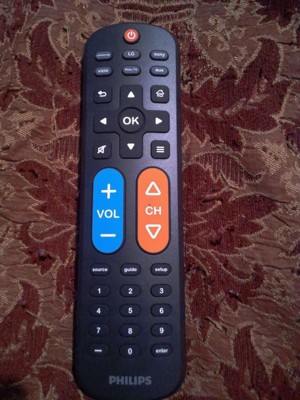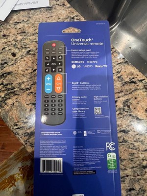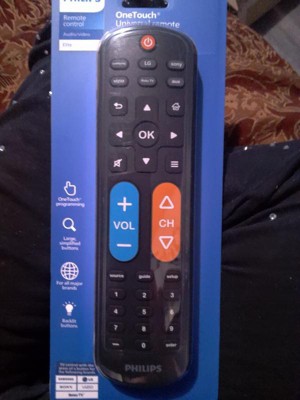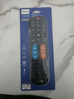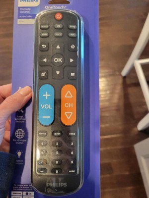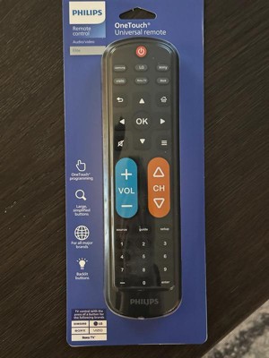Effortless setup, ultimate control — the innovative, patent-pending Philips OneTouch Universal Remote is your ticket to hassle-free entertainment. This extra-large black remote features large, easy-to-see backlit buttons, colorblind-friendly volume and channel buttons, as well as OneTouch programming for five popular TV brands: Samsung, LG, Sony, Vizio and Roku TVs, making it a great choice for seniors, the visually impaired and anyone wanting a simple, easy-to-use remote. Patent-pending OneTouch technology provides the easiest TV remote setup ever. Simply insert two AA batteries, then press the TV device button that matches your TV’s brand. With just one touch, your remote is programmed to operate your TV. The universal remote control’s AUX button comes programmed for use with Roku boxes but can easily be reset to operate one of thousands of compatible audio/video devices, such as a Blu-ray/DVD player, cable or satellite receiver, gaming console, etc., using direct code entry or auto code search programming. And, the fully backlit keypad is perfect for navigating to your favorite channels and shows in low-light settings. Take full control of all your TVs with the easiest replacement remote ever — the Philips OneTouch Replacement Remote.