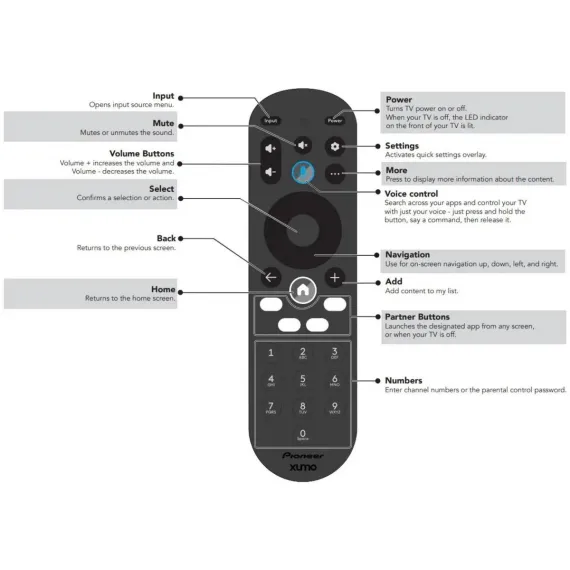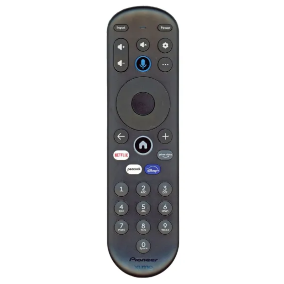 Enhance your viewing experience with the CP-RC1NA-23 remote control. Designed for seamless navigation, it features dedicated buttons for Netflix, Peacock, Disney+, and Prime Video, allowing quick access to popular streaming services. The built-in voice control streamlines searching and commands, making operation intuitive and efficient. Compatible with the Pioneer XClass Xumo TV, this remote combines convenience and functionality for expert-level media management.