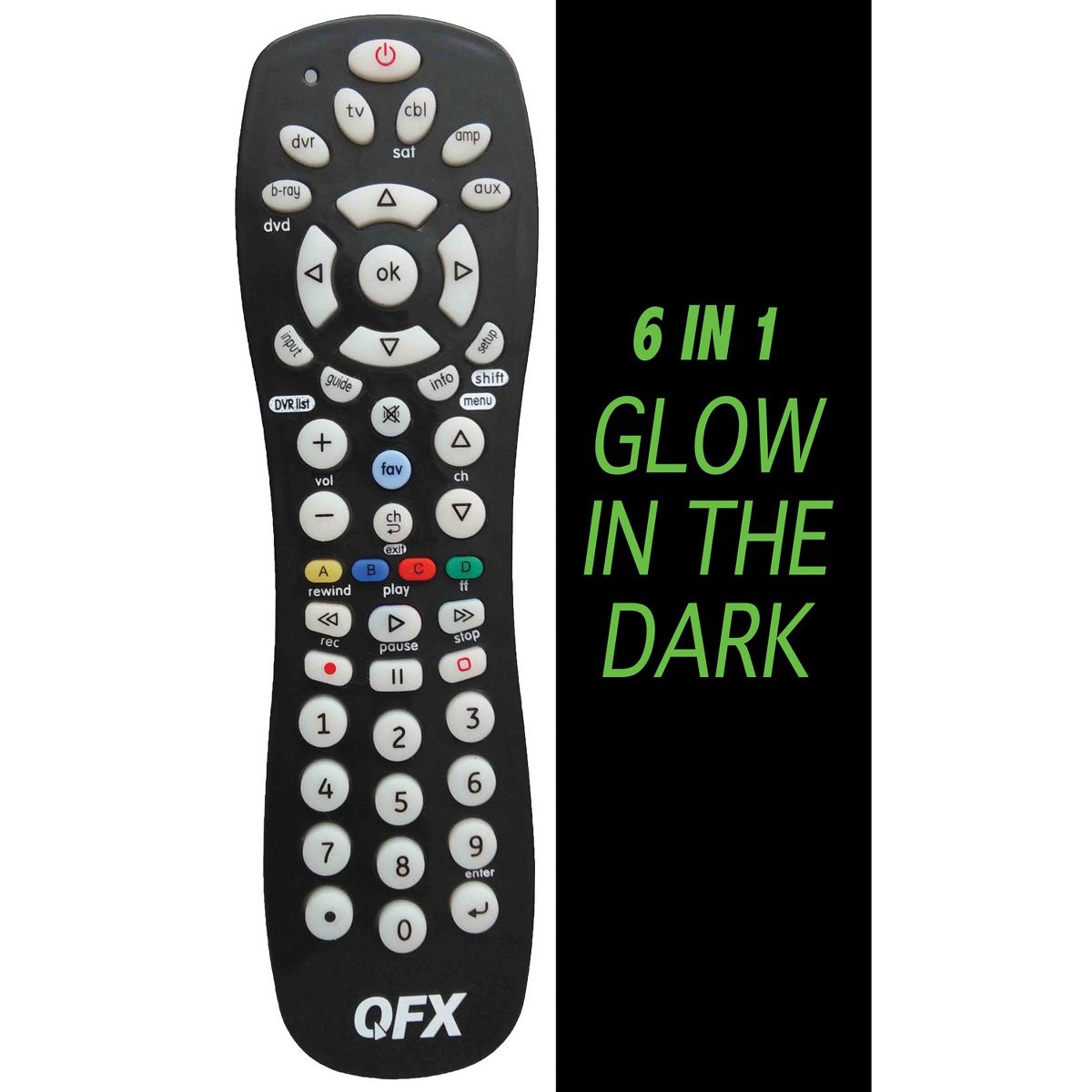 QFX® 6-Device Universal Remote with Glow-in-the-Dark Buttons, Black, Size: 6 in 1