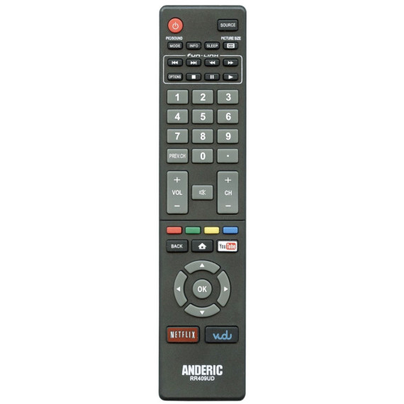 Replacement remote for Sanyo smart TVs including FS32C06F, FW50C36F, and FW50C85T models. Features direct access buttons for YouTube, Netflix, and Vudu streaming apps. The NH415UP puts your favorite entertainment just a button press away.