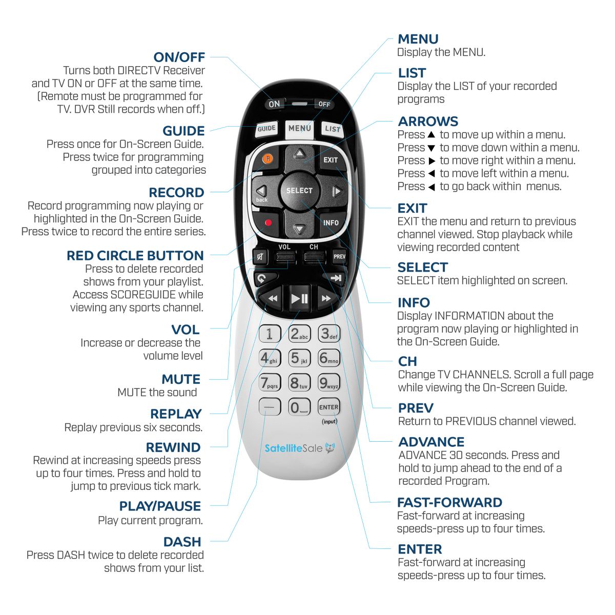 SatelliteSale Remote Control Replacement For RC73 RC72 RC71 Compatible With DirecTV HR34 HR44 HR54, AT&T Receivers, Genie DVRs