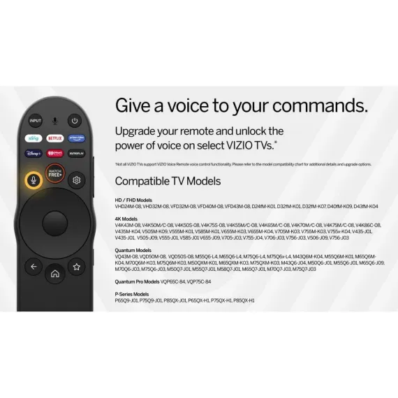 The Vizio XRT270R SmartCast Voice Remote is designed for select Vizio HD, 4K, Quantum, Quantum Pro, and P-Series models. It features built-in voice command support and direct-access buttons for popular streaming services, including Sling, Netflix, Prime Video, Redbox, iHeartRadio, Crackle, and WatchFree. No programming is required for compatible SmartCast TVs.