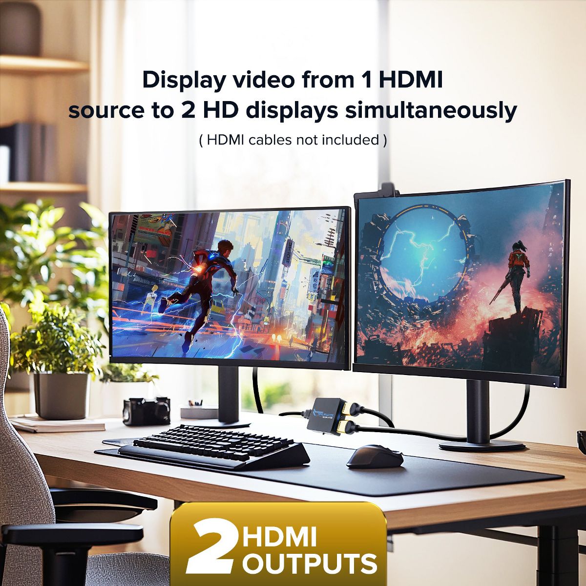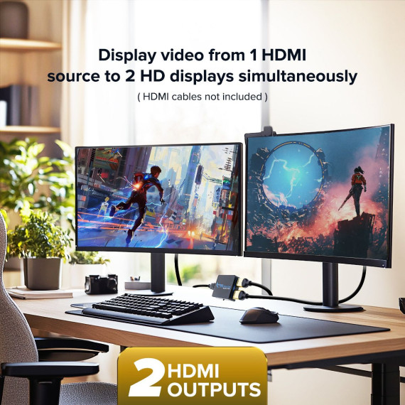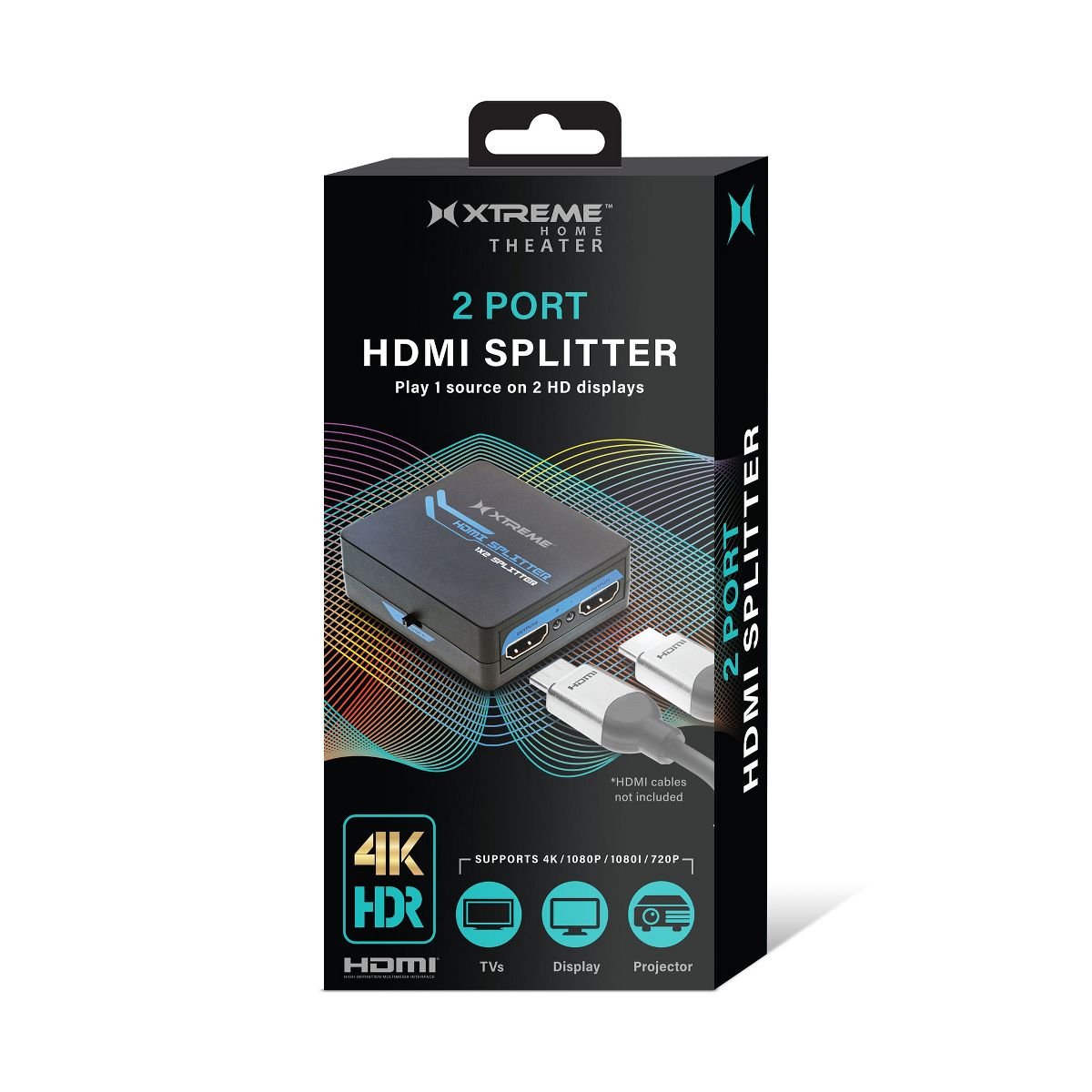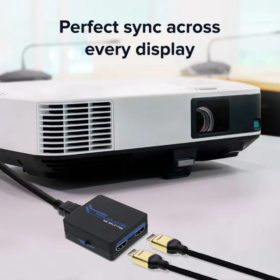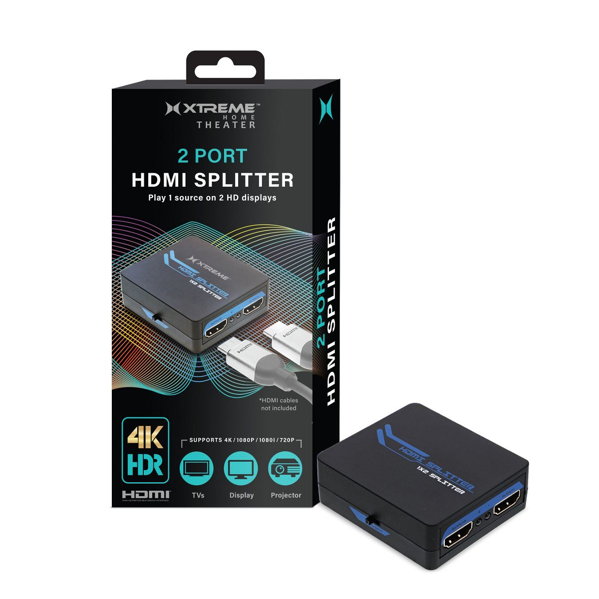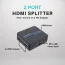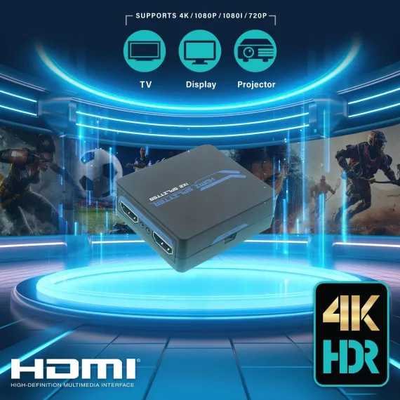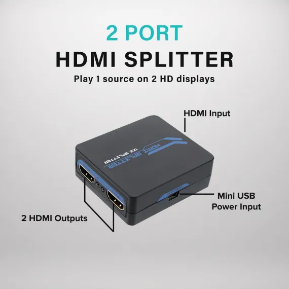The Xtreme 2-Port HDMI Splitter allows you to take video from 1 source and send it to 2 HDMI displays at the same time. For use with multiple devices including HDTVs, monitors, projectors, you can link to gaming consoles, desktop/laptop computers, streaming devices, cable boxes and Blu-Ray/DVD players to create the best possible presentations. Our splitter supports multiple video formats including 4K HD and Blu-Ray 3D viewing without any complicated setups or additional parts. It also supports different audio options ranging from Dolby 7.1 and DTS to DTS-HD Master Audio and Dolby True HD formats for crisp, clean sound presentations. Have the most immersive entertainment experiences with the 2-Port HDMI Splitter.
