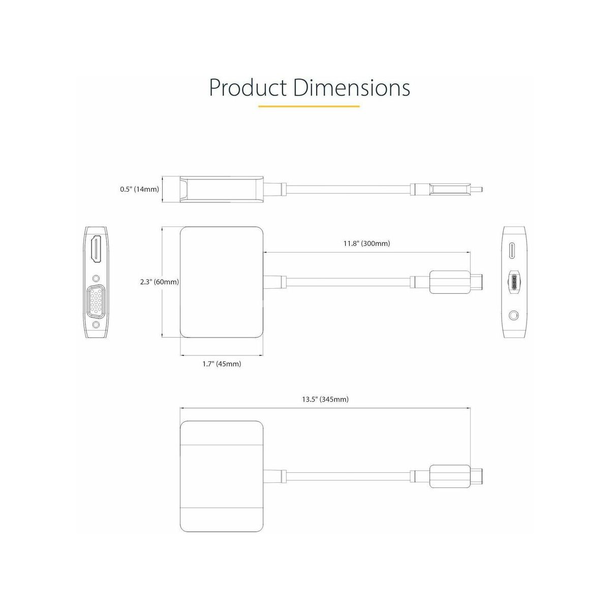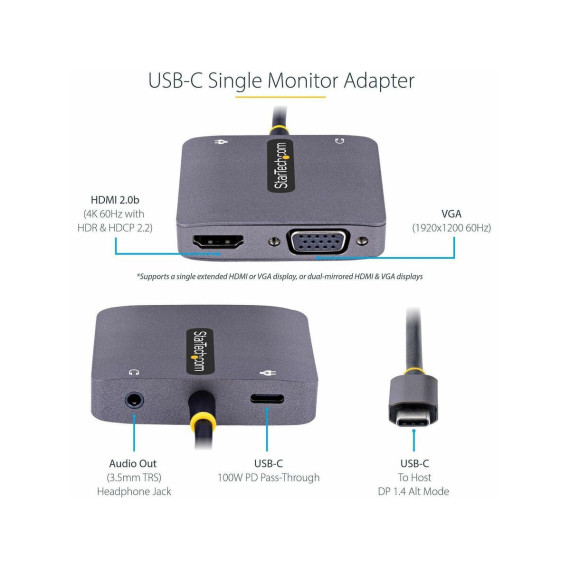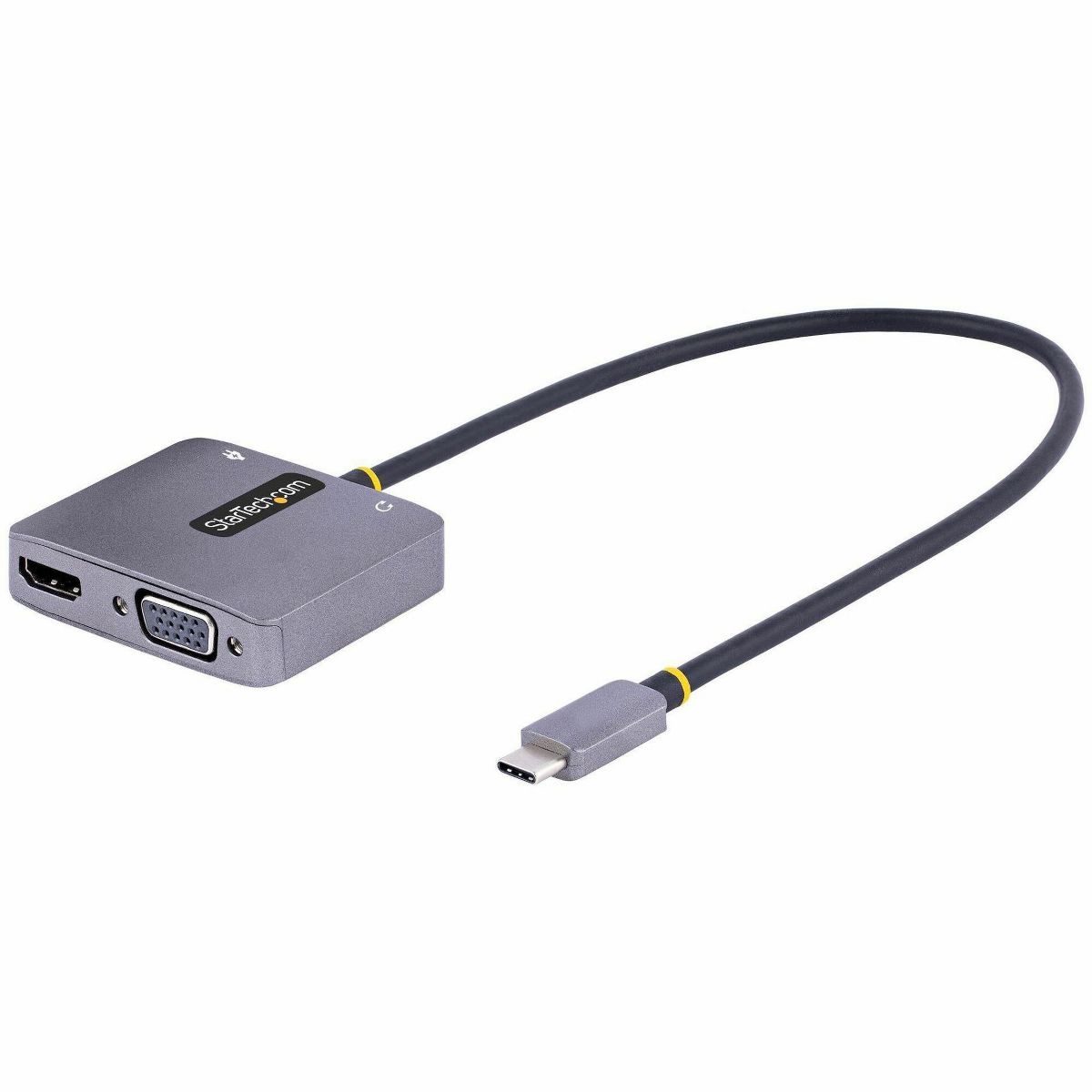 The StarTech.com USB-C Multiport Video Adapter is a portable solution designed for connecting USB Type-C devices to HDMI and VGA displays. With up to 100W of Power Delivery, this adapter facilitates versatile displays for various computing needs. It supports single or dual-mirrored video configurations, making it an ideal choice for presentations and multitasking. Additionally, the extra-long attached cable helps reduce strain on device ports, ensuring a seamless experience whether you're at home or on the go.