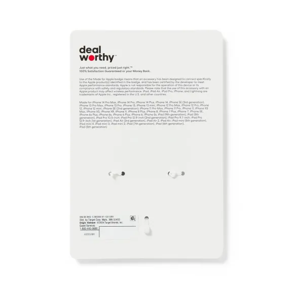 Experience clear audio and hassle free connectivity with the 3' Lightning to Aux Cable - dealworthy™ White. This cable features a 3.5mm jack at one end and a Lightning connector at the other that's compatible with iPhone 14 and older models and select iPads. With a warranty lasting for one year, you can rely on this 3-foot cable for high-quality audio connections, whether you're listening to music or making calls.