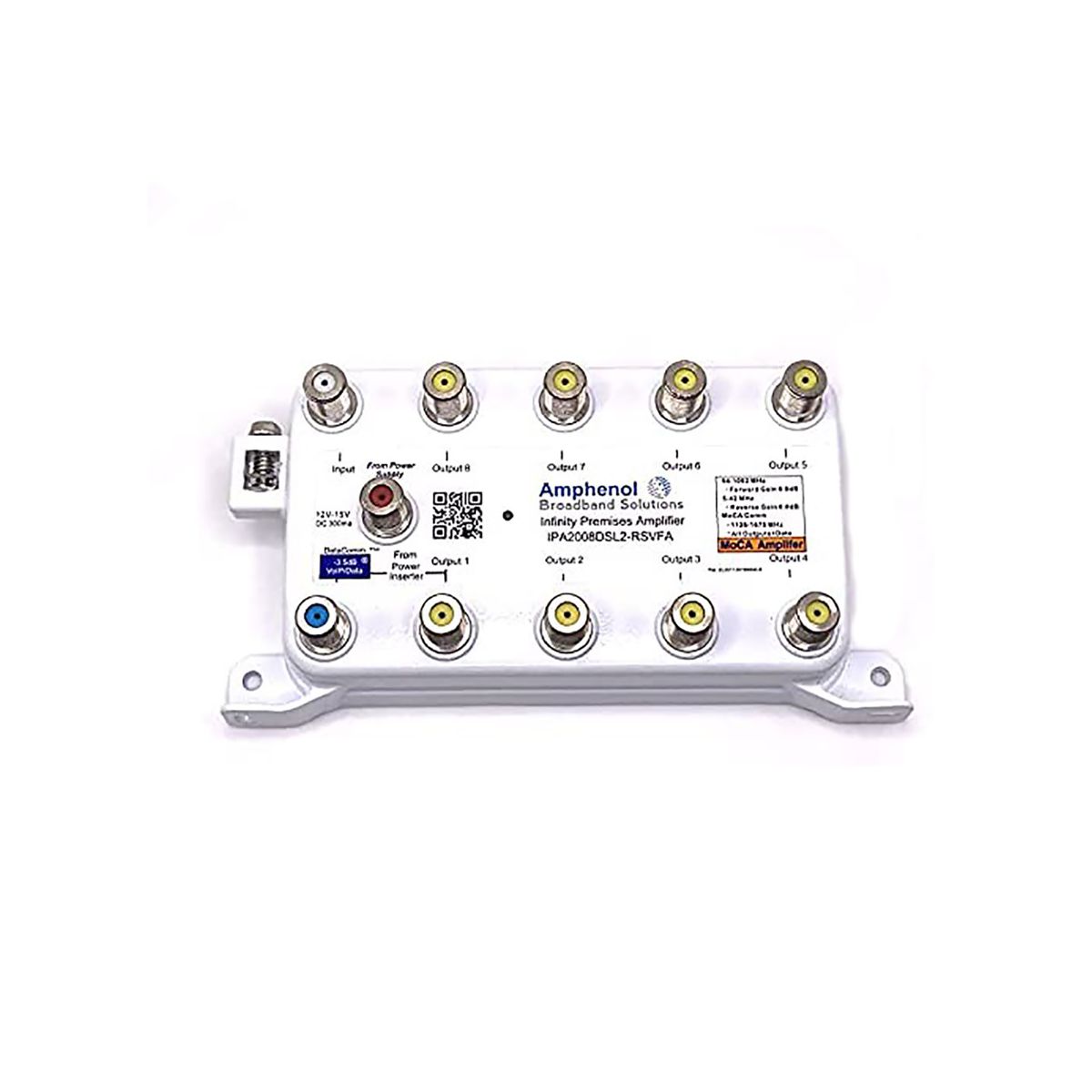 TV ANTENNA AMPLIFIER SIGNAL BOOSTER | Amphenol MOCA COAX AMPLIFIER IPA2008DSL2-RSVFA | Moca amplifier for cable TV providers 8 RF + Crosstalk Outputs 1 Passive VoIP DataComm Port Data Plus Amplifiers include unique design features to increase reliability and decrease installation time. The unique DataComm TM feature set allows MoCA communication between the passive data port and all active output ports on the 2000 series Infinity Premise Amplifiers. CrossTalk TM allows MoCA to freely communicate between all RF outputs. Technicians no longer need to worry about where they connect MoCA devices. Uninterrupted VoIP Service Passive VoIP / Cable Modem Data Port Data Stabilization (Power Failure Impedance Protection) No Mechanical Switches Unity Gain Forward and Reverse MoCA 2.0 CrossTalk TM MoCA Communication between Data Port and all RF Outputs Built-in MoCA Filter Powder Coated True Flex Housing UL Approved USE IT ANYWHERE - Premise, Multi-Dwelling Units (MDU) and Business.