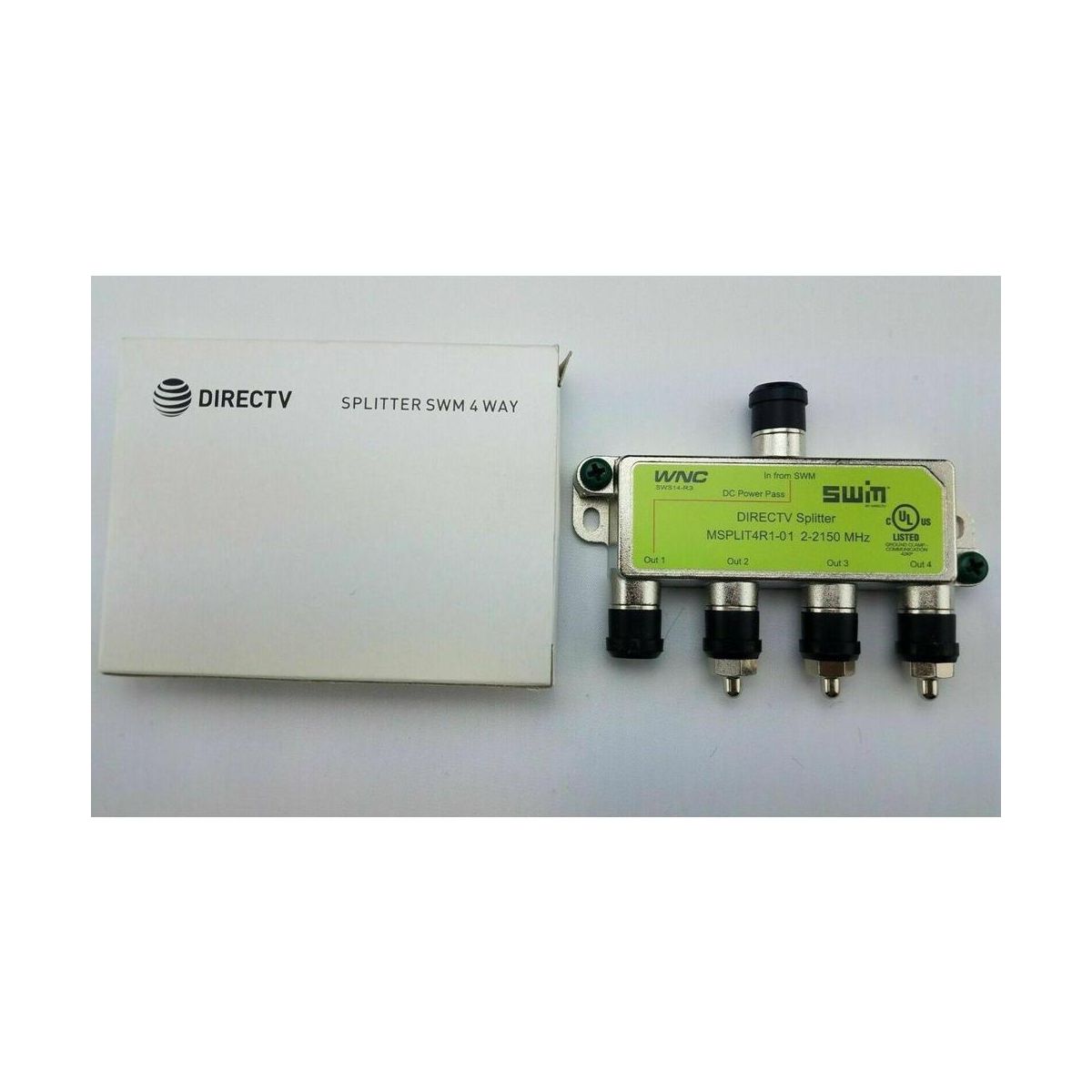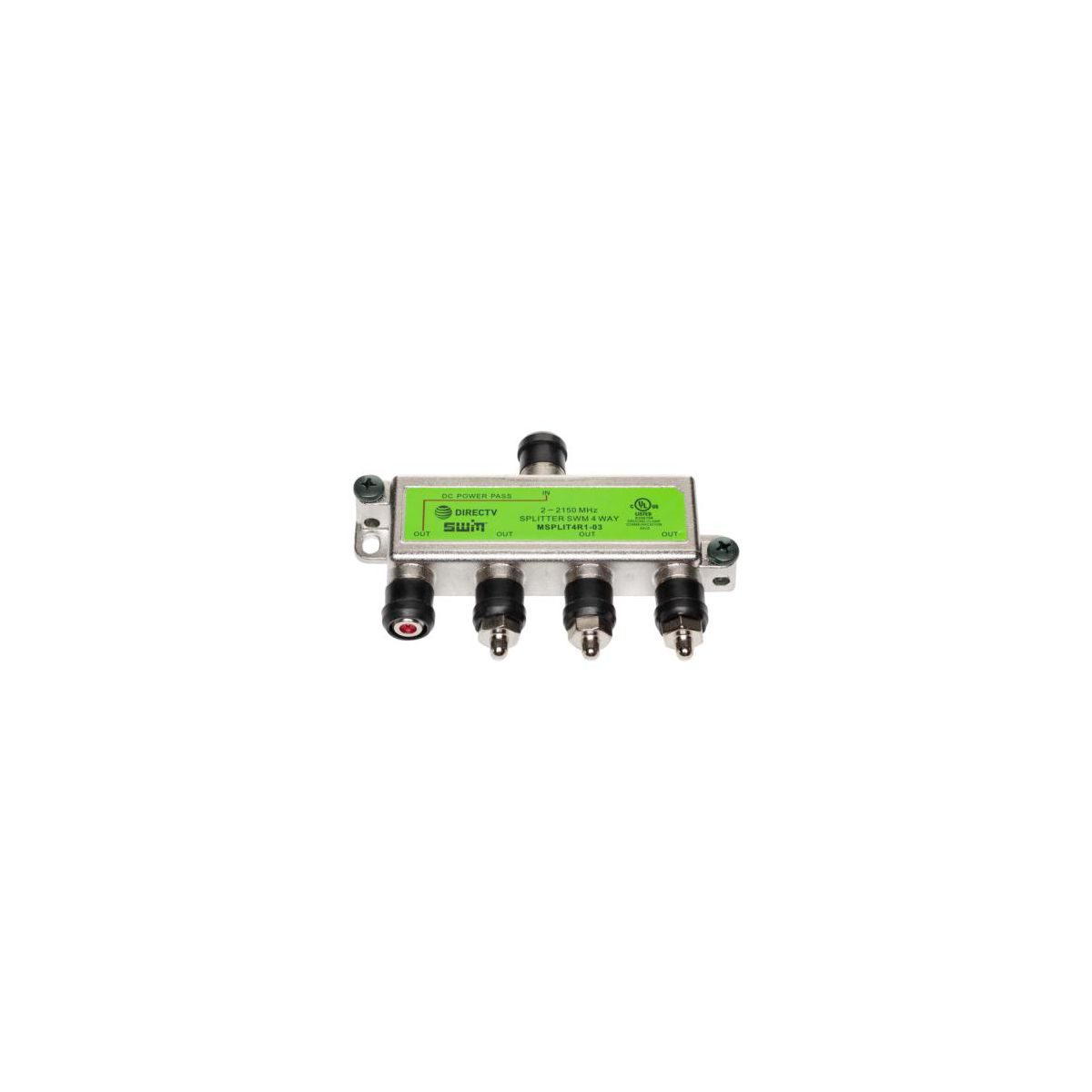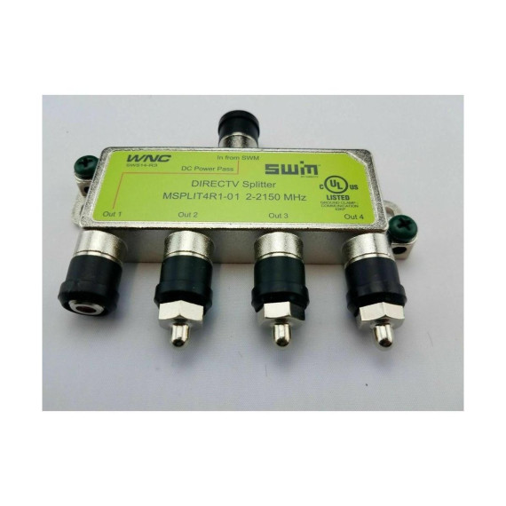 Brand New DIRECTV Approved SWM MRV 4-Way Wide Band Splitter MSPLIT4R1-03 Green This 2-2150 MHz four-way splitter is used to split a single line from a SWM Switch or LNB to four lines to feed four receivers. Indoor/outdoor SWM splitter features one input and four outputs, one of which passes DC power, which is labeled in red. This high isolation wideband splitter is compatible with all SWM and MRV installations. This green label DIRECTV-approved splitter for multi-room viewing is the splitter to use for DIRECTV whole-home service. Key features* DIRECTV approved for whole-home viewing used with SWM installations* 500mA DC passing from one port only* High isolation between outputs* Diode steered protection* Only recommended for DIRECTV SWM systems* Manufacturers may vary