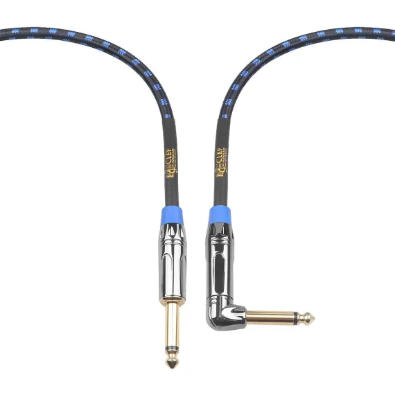 Clef Audio Labs 6.35mm TS to 6.35mm TS Straight to Angled, Black Chrome Zinc Alloy Shell/Blue Braided - 15FT-1PK