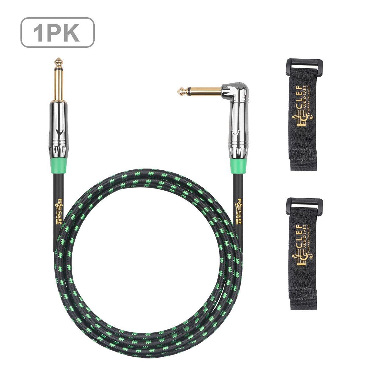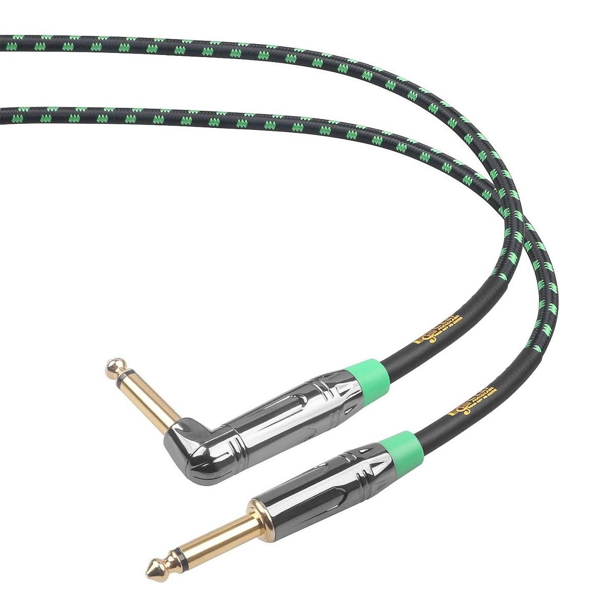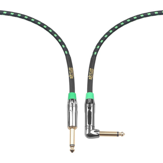 Clef Audio Labs 6.35mm TS to 6.35mm TS Straight to Angled, Black Chrome Zinc Alloy Shell/Green Braided - 10FT - 1PK