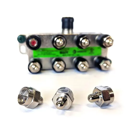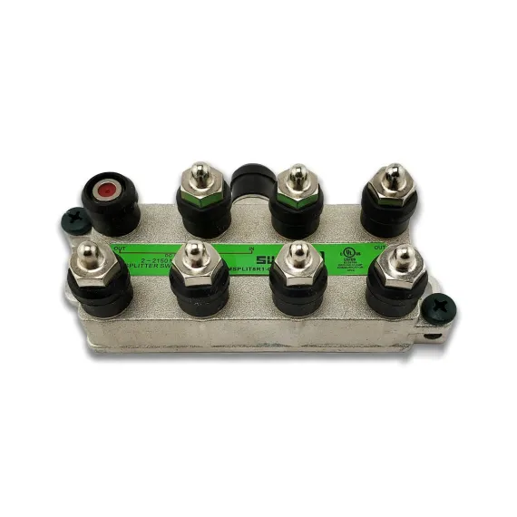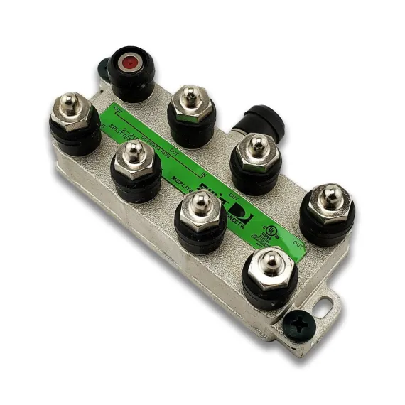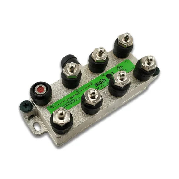DirecTV ATT 8 way SWM power passing coaxial splitter. This 8-way wideband splitter is used exclusively on DIRECTV SWM satellite dishes or SWM multiswitches to distribute the signal to receivers. The SPLIT2MRV features one port (red) with a DC path for remotely feeding power back through the splitter up to the dish or multiswitch, making it convenient for indoor and outdoor use. Key features: The green label indicates this is DIRECTV. Approved for Multi Room Viewing (MRV). Includes signal terminators on 7 of the ports to reduce signal leakage and interference. Allows for powering SWM multiswitches and LNBs remotely. Only recommended for DIRECTV SWM systems. Removable rubber seals ensure weatherproof connections for long-lasting durability. Includes mounting screws. Please don't hesitate to contact us with any questions.