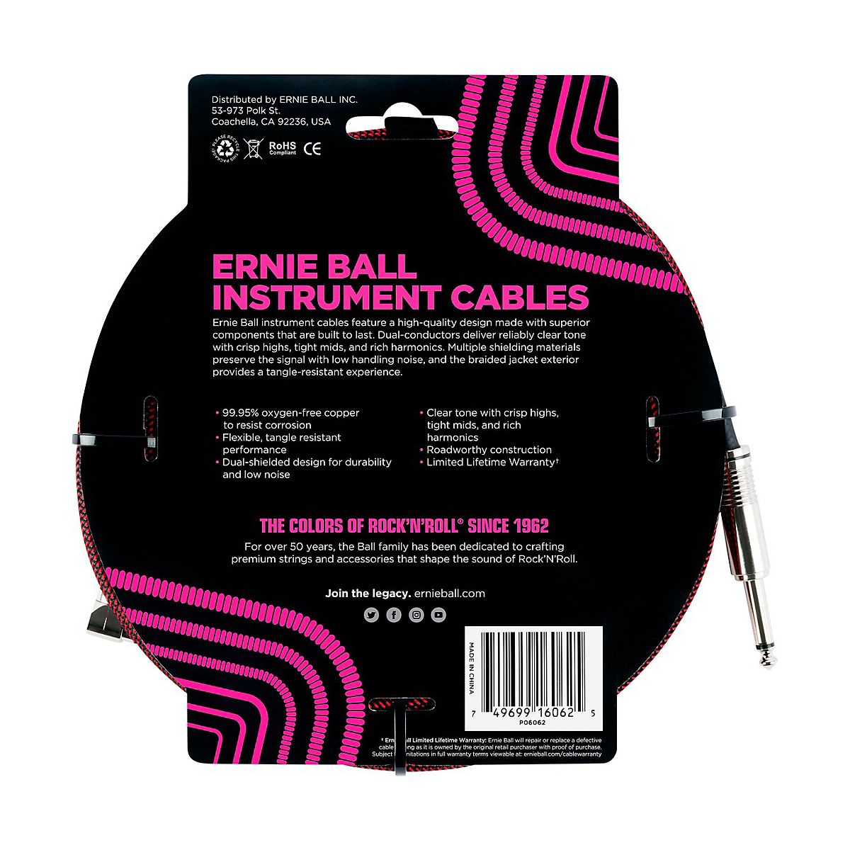 Ernie Ball instrument cables feature a high-quality design made with superior components that are built to last. Dual-conductors deliver reliably clear tone with crisp highs, tight mids, and rich harmonics. Multiple shielding materials preserve the signal with low handling noise, and the braided jacket exterior provides a tangle-resistant experience.