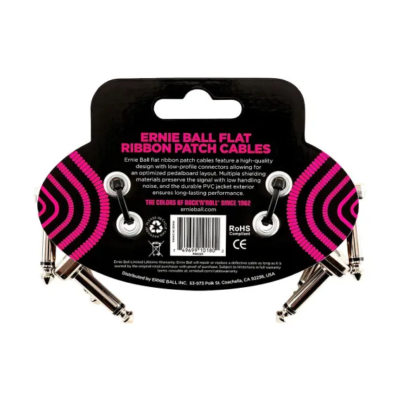 Ernie Ball flat ribbon patch cables feature a high-quality design made with superior components that are built to last. The flat cable design and low-profile connectors allow for optimized pedalboard lat and cable routing. Multiple shielding materials preserve the signal with low handling noise, and the durable PVC jacket exterior ensures long-lasting performance. This is a pack of three cables.