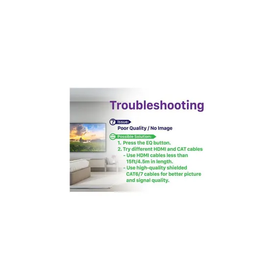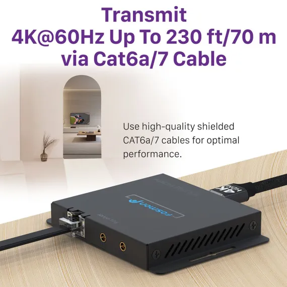 - Extension Range: 70 m (230 ft) – 4K@60Hz 4:4:4 (CAT6a/7 cable)
