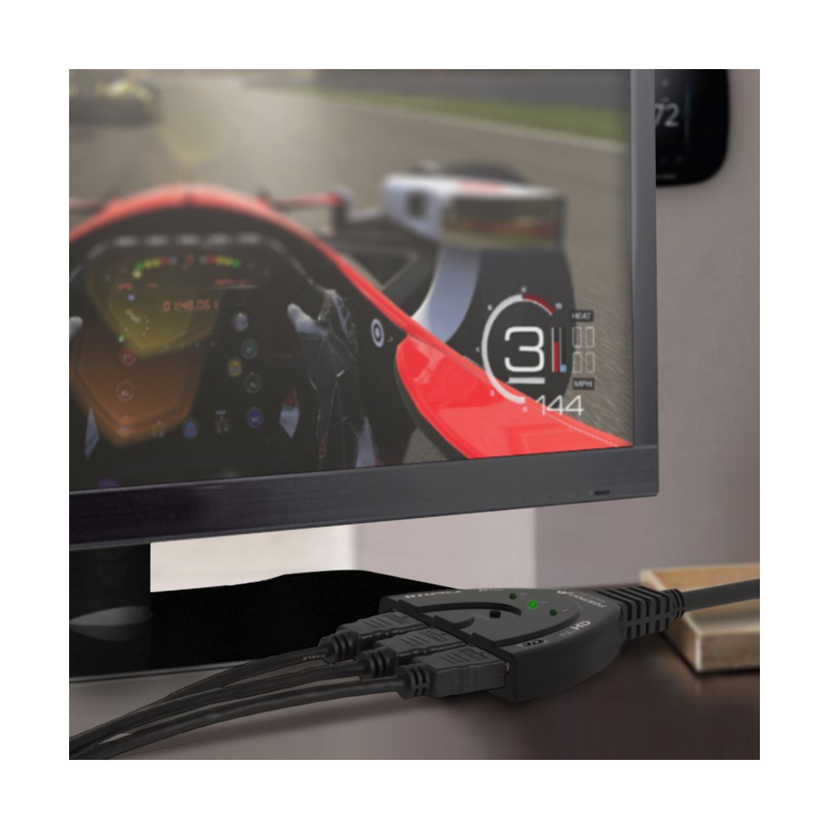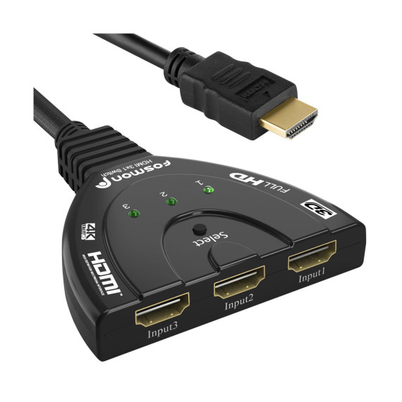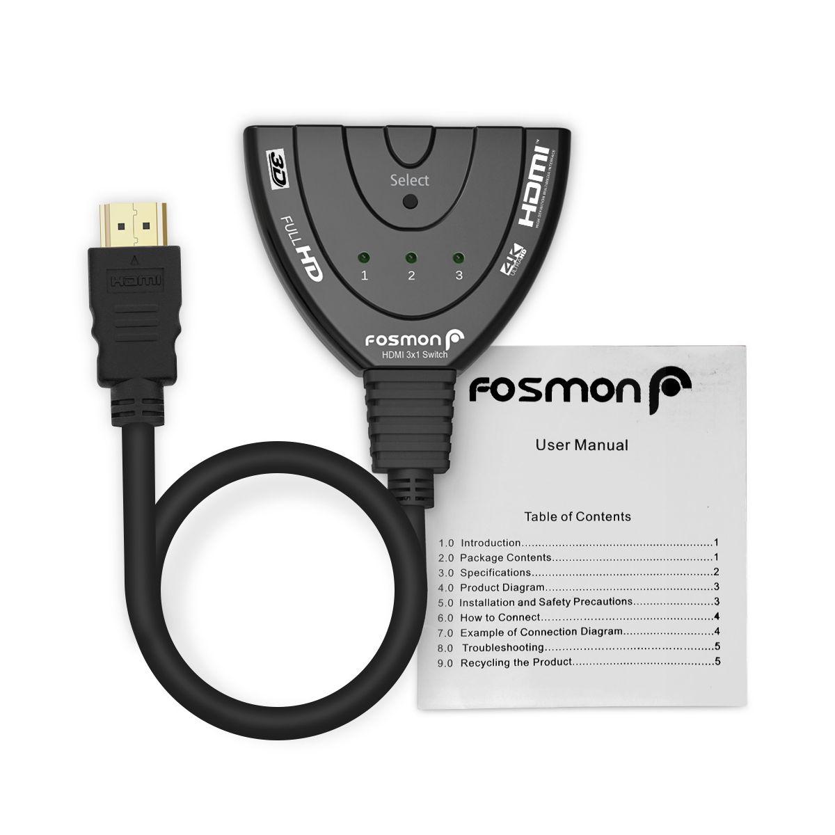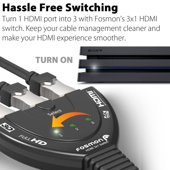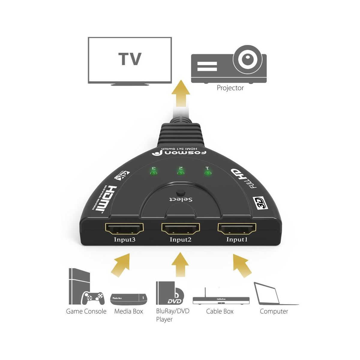 Fosmon's 3x1 HDMI switch makes a single HDMI port into three, allowing you to use three HDMI devices from one HDMI port. Make your gaming and viewing experience a smoother adventure. No more worrying about not having enough HDMI ports.