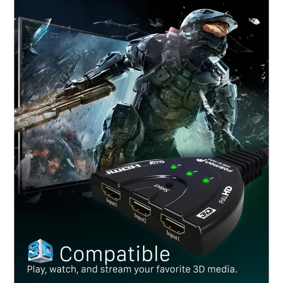 Fosmon's 3x1 HDMI switch makes a single HDMI port into three, allowing you to use three HDMI devices from one HDMI port. Make your gaming and viewing experience a smoother adventure. No more worrying about not having enough HDMI ports.