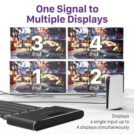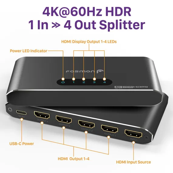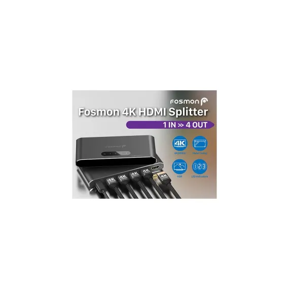 Experience seamless content sharing with our Fosmon 4K HDMI Splitter. Enjoy pristine 4K@60Hz resolution on up to four synchronized displays, perfect for immersive entertainment or efficient presentations. Note: Ideal HDMI cable length should not exceed 10 meters (32.8 feet) for optimal performance.