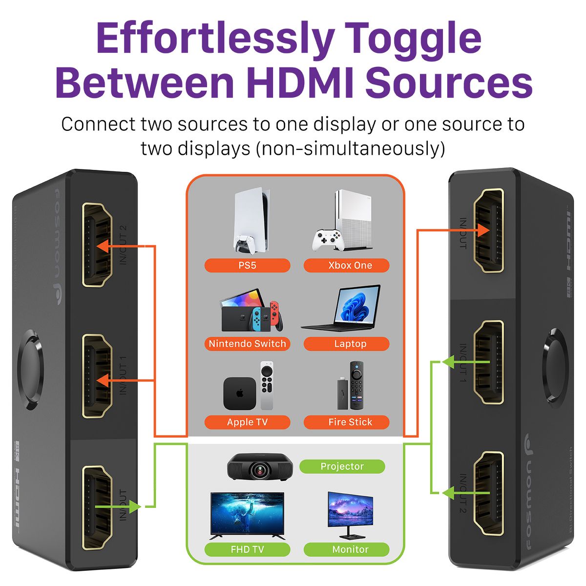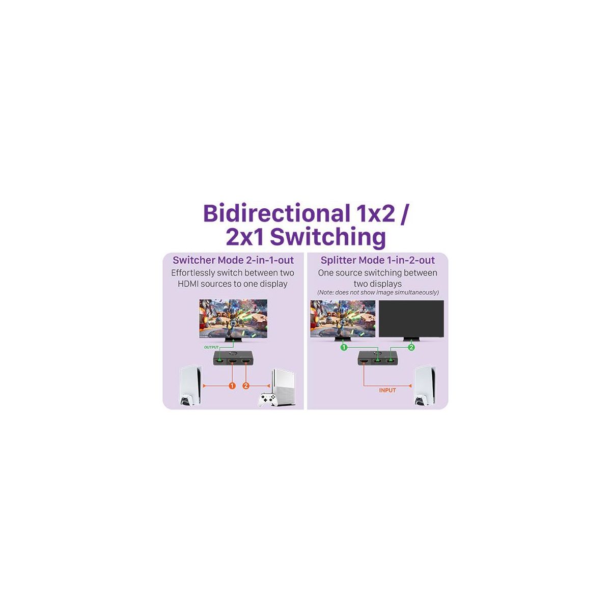 Effortlessly toggle between HDMI sources with our Fosmon bidirectional HDMI switcher. Connect two sources to one display or one source to two displays (non-simultaneous). Expand your HDMI 2.1 ports on your smart TV or monitor. Instantly switch between different sources with a simple click of a button with no quality loss or delay. There are two modes: 2-in-1-out or 1-in-2-out for flexible signal routing with no cable hassle.
