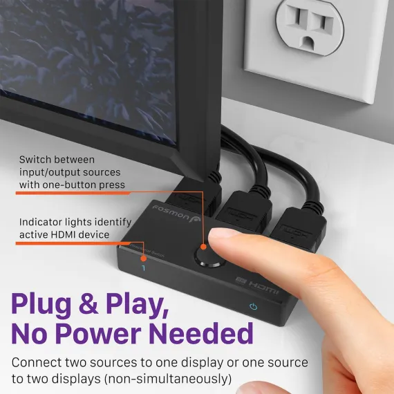 Effortlessly toggle between HDMI sources with our Fosmon bidirectional HDMI switcher. Connect two sources to one display or one source to two displays (non-simultaneous). Expand your HDMI 2.1 ports on your smart TV or monitor. Instantly switch between different sources with a simple click of a button with no quality loss or delay. There are two modes: 2-in-1-out or 1-in-2-out for flexible signal routing with no cable hassle.