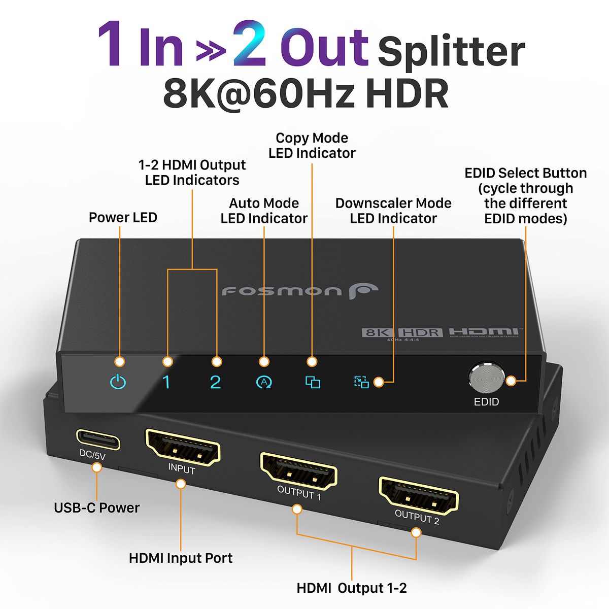 Easily configure your display settings with three EDID modes (Auto, Copy, and Downscaler) to optimize compatibility with different display devices. The built-in EDID switch and LED indicators make it simple to adjust and monitor your settings in real-time. The power LED and HDMI output LED indicators provide clear status updates for a hassle-free user experience. Powered by USB-C, this ensures stable and reliable power to your splitter, making it a convenient and efficient choice for home theaters, offices, and gaming setups.