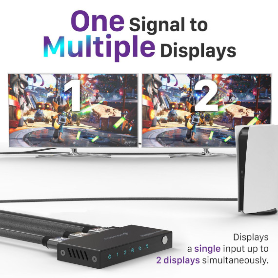 Effortlessly share your content across two displays with the Fosmon 1x2 HDMI splitter, which allows you to connect one HDMI input source and split it to two HDMI output devices simultaneously. Whether you are mirroring a presentation on multiple screens, setting up a dual-monitor workstation, or sharing media across a home entertainment system, this splitter provides a reliable, high-performance solution. No lag, no quality loss. Just seamless transmission of your favorite content across multiple displays.