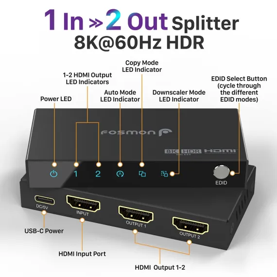 Effortlessly share your content across two displays with the Fosmon 1x2 HDMI splitter, which allows you to connect one HDMI input source and split it to two HDMI output devices simultaneously. Whether you are mirroring a presentation on multiple screens, setting up a dual-monitor workstation, or sharing media across a home entertainment system, this splitter provides a reliable, high-performance solution. No lag, no quality loss. Just seamless transmission of your favorite content across multiple displays.