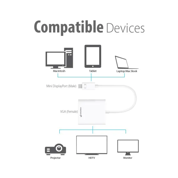 Fosmon Mini DisplayPort makes a great companion for your Mac, PC or tablet equipped with Mini DisplayPort. This adapter allows you to connect your device to a standard analog external display such as monitor, projector, or LCD with a VGA cable (not included).