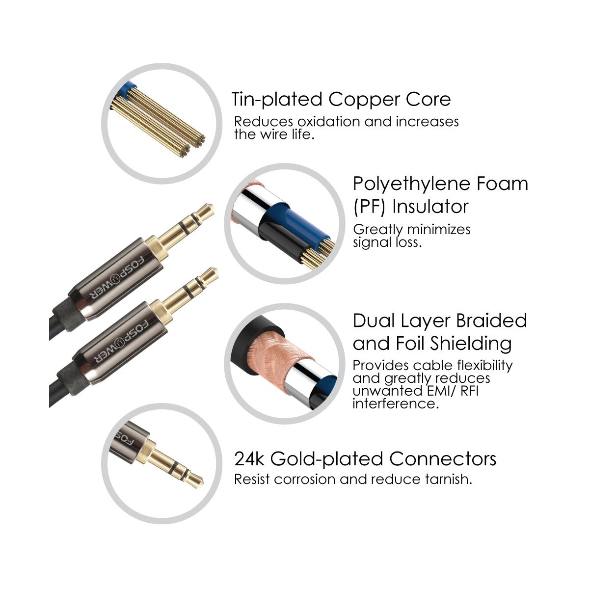 The core of the stereo audio cables is covered with a polyethylene foam (PF) dielectric insulator, significantly minimizing signal loss.