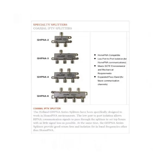 The Holland GHPNA-* splitters have been specifically designed to work in HPNA environments. The low port to port isolation allows HPNA communication signals to pass through the splitters to set top boxes with as little signal loss as possible. At the same time, the GHPNA Series splitters provide good return loss and isolation for in band frequencies other than HPNA. Features: