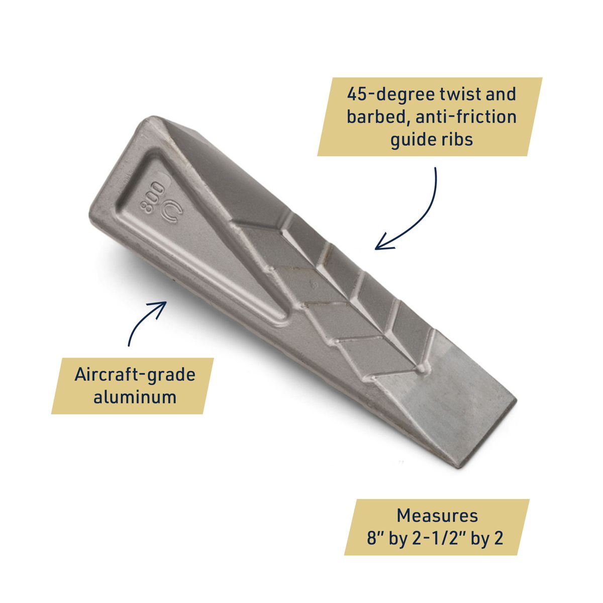 Tackle tough tree felling and log splitting jobs with the Wedge Tool by Kings County Tools. Our wood splitting wedges are made from hand-forged, aircraft-grade aluminum with a 45-degree twist and barbed anti-friction guide ribs to help prevent bounce-back and make driving easier. The aluminum material is rust-resistant and lightweight for easy portability, and unlike steel, it will give rather than splinter when struck to reduce the risk of dangerous shrapnel. Kings County Tools is your source for wood splitting wedges and other manual log splitters for firewood with quality you can count on.