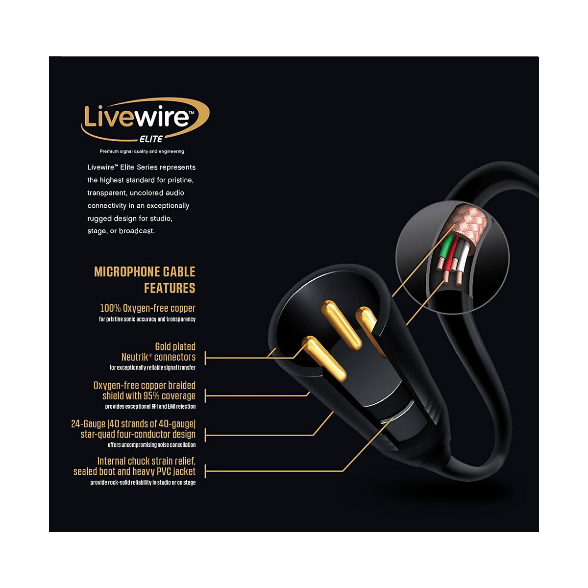 Microphone cable with gold-plated Neutrik connecters, 100% oxygen-free copper, 24-gauge 4-conductor design; braided copper shield (95% coverage). Internal chuck strain relief, a sealed boot and a heavy PVC jacket provide rock-solid reliability in the studio or on stage. Livewire Elite Quad XLR microphone cables represent the highest standard for pristine, transparent, uncolored audio connectivity in an exceptionally rugged design for studio, stage or broadcast. They offer exceptional RFI and EMI rejection and are guaranteed for life.