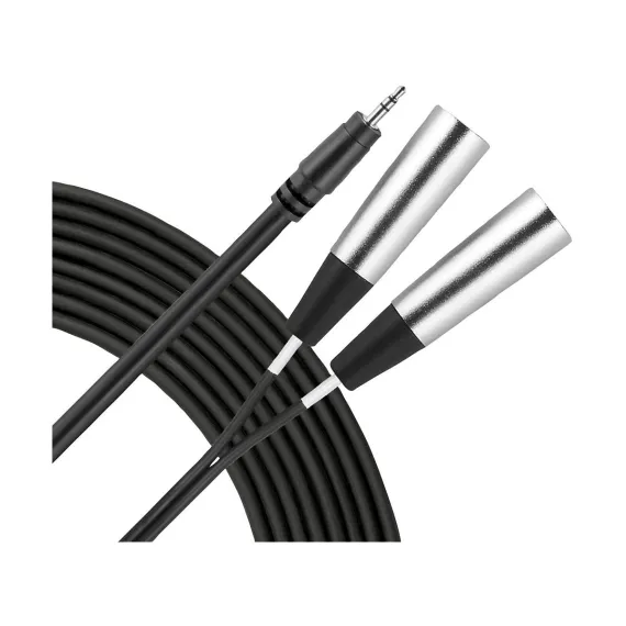 3.5 mm TRS male to dual XLR male. Sturdy, reliable audio component connectors with molded strain relief.