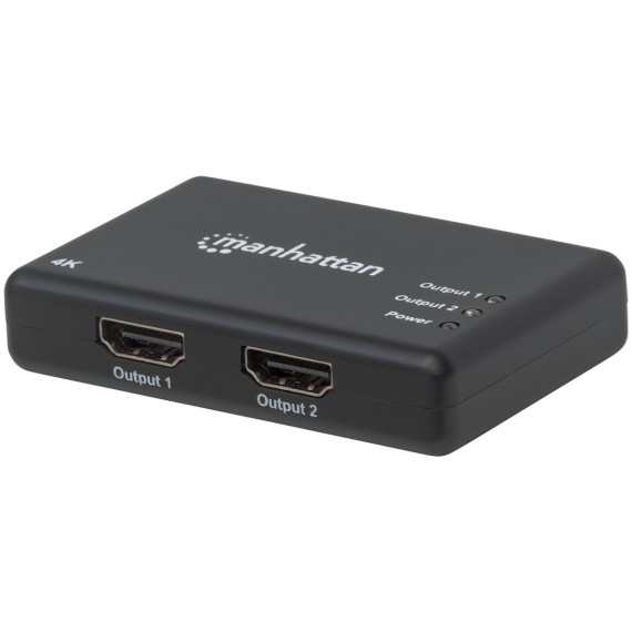 The Manhattan 4K 2 Port HDMI Splitter sends a 4K at 30 Hz HDMI signal from a single UHD source to up to 2 UHD displays. Ideal for trade shows, classrooms, video conferencing, presentations and retail applications, the Manhattan 4K HDMI Splitter features a built in booster for added signal strength. It’s a good choice for splitting and distributing a synchronous signal to multiple 4K HDMI displays when source equipment is remotely stored in a secured room or cabinet. Cascade multiple units up to 3 levels to output HDMI video/audio on additional displays in widely distributed applications._