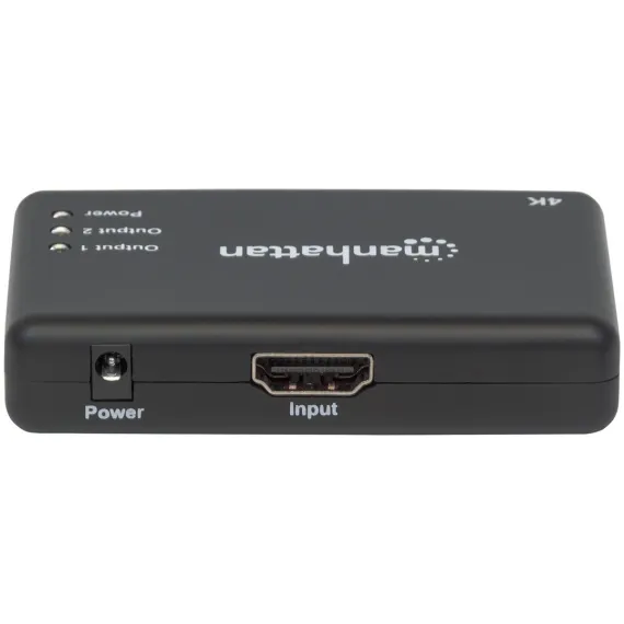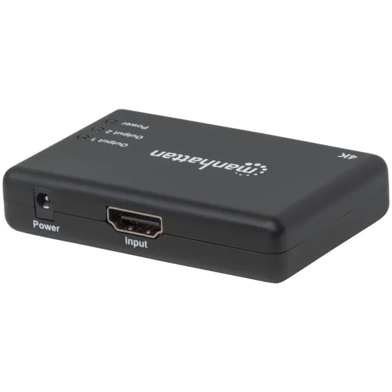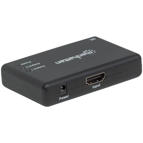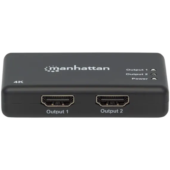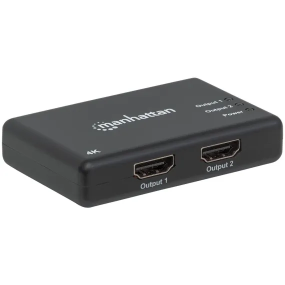 The Manhattan 4K 2 Port HDMI Splitter sends a 4K at 30 Hz HDMI signal from a single UHD source to up to 2 UHD displays. Ideal for trade shows, classrooms, video conferencing, presentations and retail applications, the Manhattan 4K HDMI Splitter features a built in booster for added signal strength. It’s a good choice for splitting and distributing a synchronous signal to multiple 4K HDMI displays when source equipment is remotely stored in a secured room or cabinet. Cascade multiple units up to 3 levels to output HDMI video/audio on additional displays in widely distributed applications._